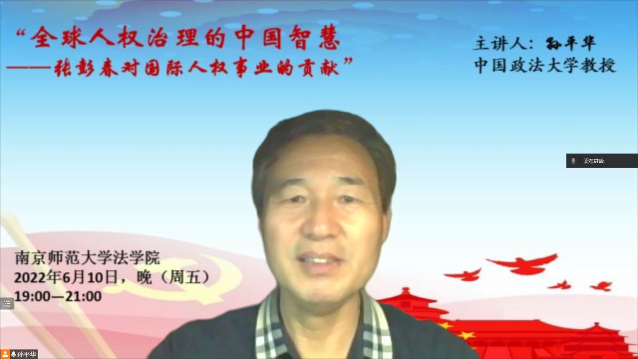 在正式的专题讲座中,孙平华教授围绕“全球人权治理”展开,讲述张彭春的个人事迹及其对国际人权事业的贡献,突出展现全球人权治理的中国智慧,并分享在“全球人权治理的中国智慧”研究过程中的心路历程。讲座内容共分为七个部分。