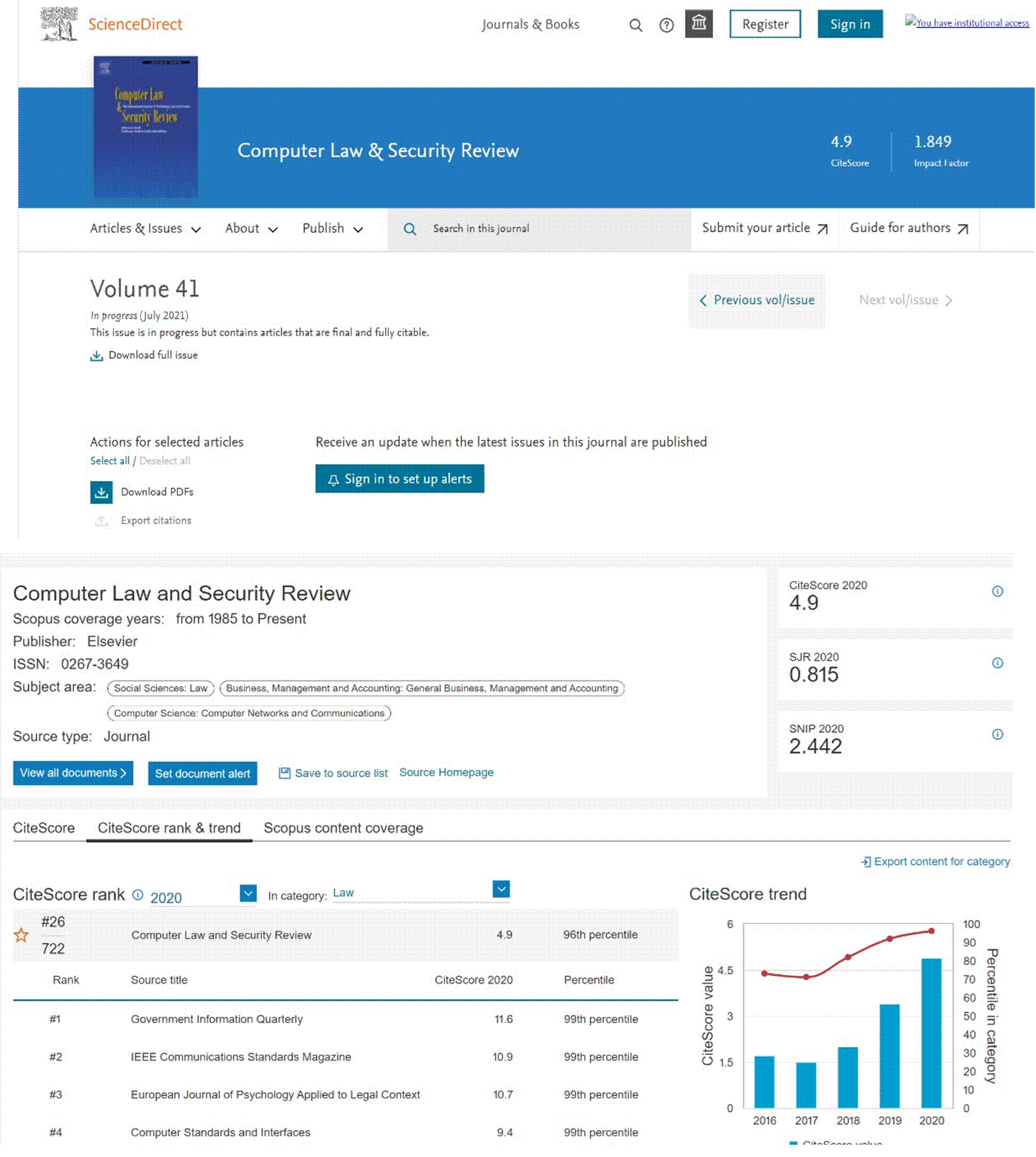 据出版发行商爱思唯尔(Elsevier)网站显示,《计算机法律与安全评论(Computer Law & Security Review)》创办于1985年,是以互联网法律、网络安全、数据保护、电子商务等网络前沿问题为主要特色的国际性学术期刊,是世界范围内科技法律期刊中唯一入选SSCI目录的国际性期刊,每年出版4期,年度发文量60篇左右。