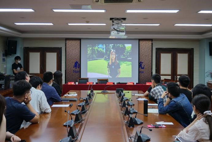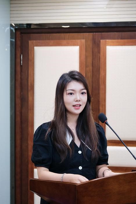 接着,新生代表丁文睿同学向南师大和马里兰大学的各位老师和工作人员表示衷心的感谢,同时也讲述了她自己过去学习生活中的心得体会,以及为何选择了南师大和马里兰合作办学的项目作为自我提升的新起点。丁文睿同学表示,现在比以往任何时刻都面临更大的不确定性,面对时代的湍流,希望同学们都能够踏实严谨、志存高远,保持“正德厚生、笃学敏行”的南师大底色,以坚定的姿态面对未知的挑战。