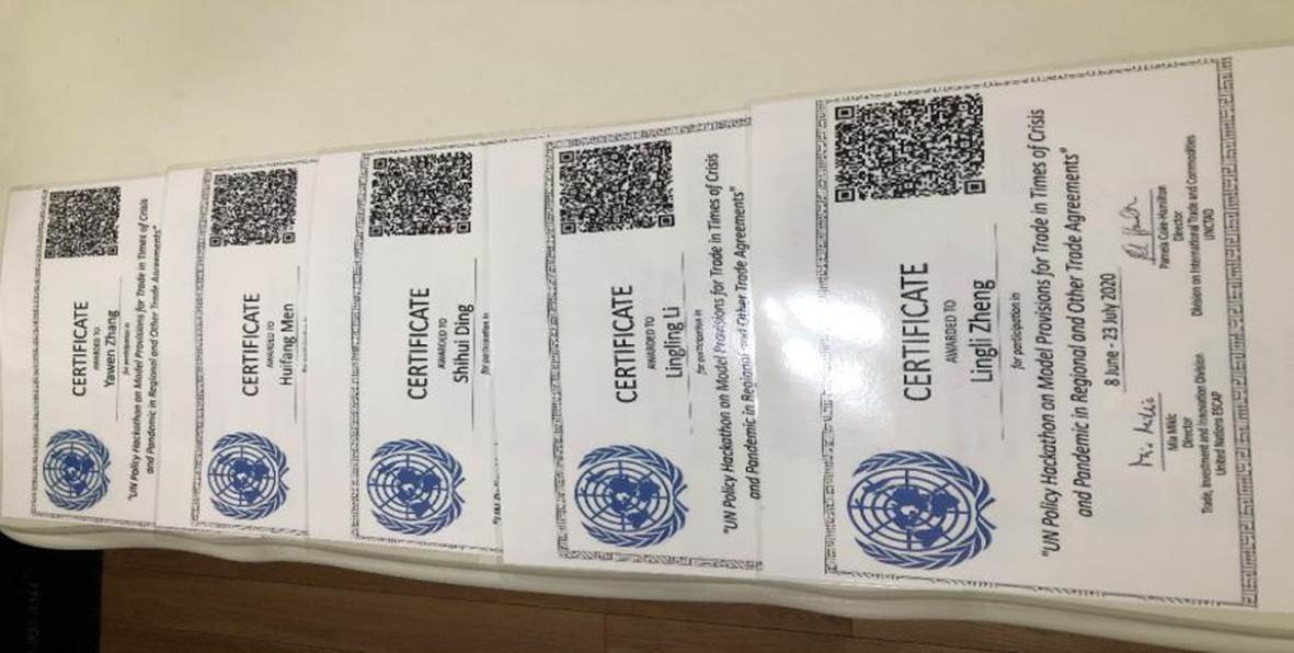 郑玲丽副教授带领的南师大科研团队,经专家评选成功获得联合国亚太经济与社会委员会(UNESCAP)“疫情及危机下区域贸易协定示范条款政策编程马拉松”课题立项,与全球62个国家、45个团队、134位个人专家同台竞技。经过全球专家层层筛选,最终英文研究报告“Legality of China’s Export Rebate of Animal Products & Policy Implications for RTAS during COVID-19”录入UNESCAP在线智库,同时该课题主持人郑玲丽及参与成员2018级硕士研究生门慧芳、丁诗慧、李陵玲和2019级硕士研究生张亚文均获得联合国UNESCAP颁发的获奖证书。