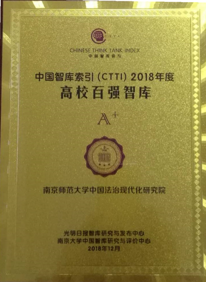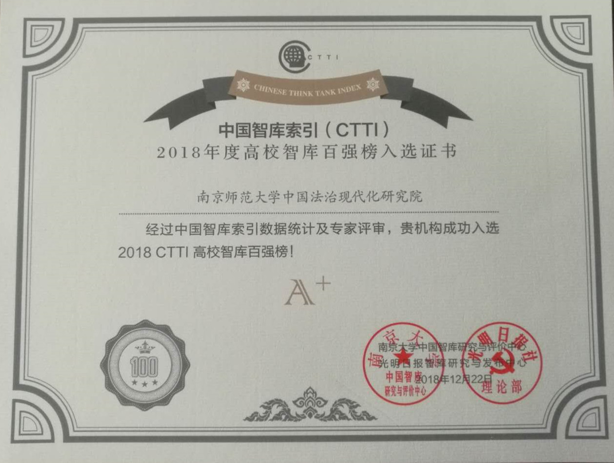 由公丕祥教授领导的南京师范大学中国法治现代化研究院进入2018中国高校智库A+级榜单。北京大学、清华大学、中国人民大学等25家来源智库获此殊荣。另有35家40家来源智库分别进入CTTI高校智库A级和A-级榜单。