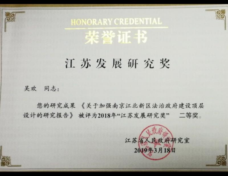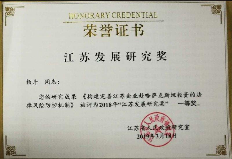 其中,杨丹副教授撰写的决策咨询报告《构建完善江苏企业赴哈萨克斯坦投资的法律风险防控机制》获评优秀成果一等奖;吴欢副教授撰写的决策咨询报告《关于加强南京江北新区法治政府建设顶层设计的研究报告》获评优秀成果二等奖。此外,以中国法治现代化研究院特邀研究员、江苏方德律师事务所主任丁韶华博士为第一作者的决策咨询报告《以“系统化思维”防控江苏金融风险的政策建议》获评优秀成果一等奖。