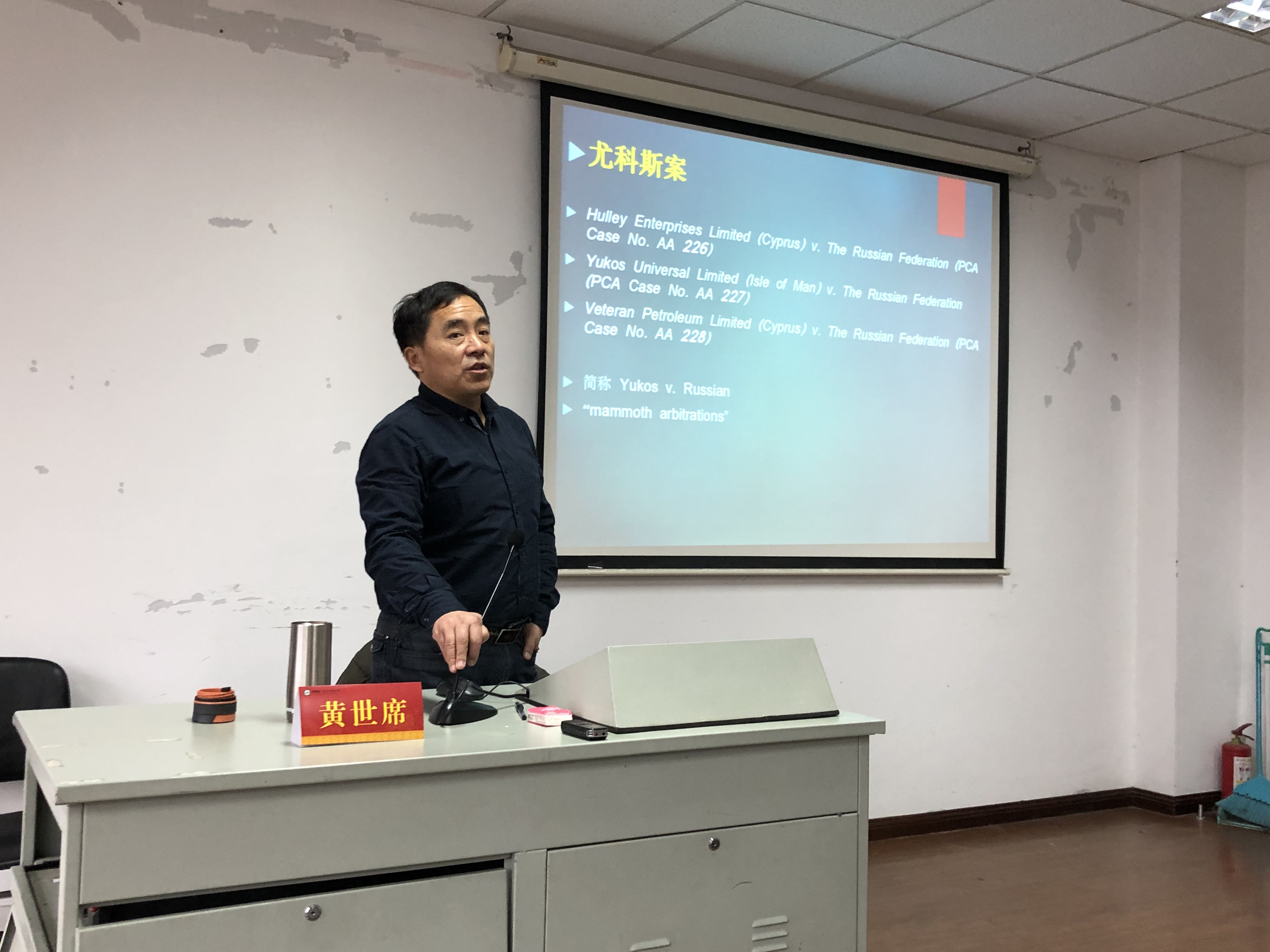 Professor Huang started the lecture with the introduction of Yukos case, which was followed with five legal issues: basic characteristics of investment arbitration, the development of international investment arbitration, the reform of international investment arbitration mechanism, the evaluation of some cases involving Chinese parties and the possible measures of Chinese parties in those cases.