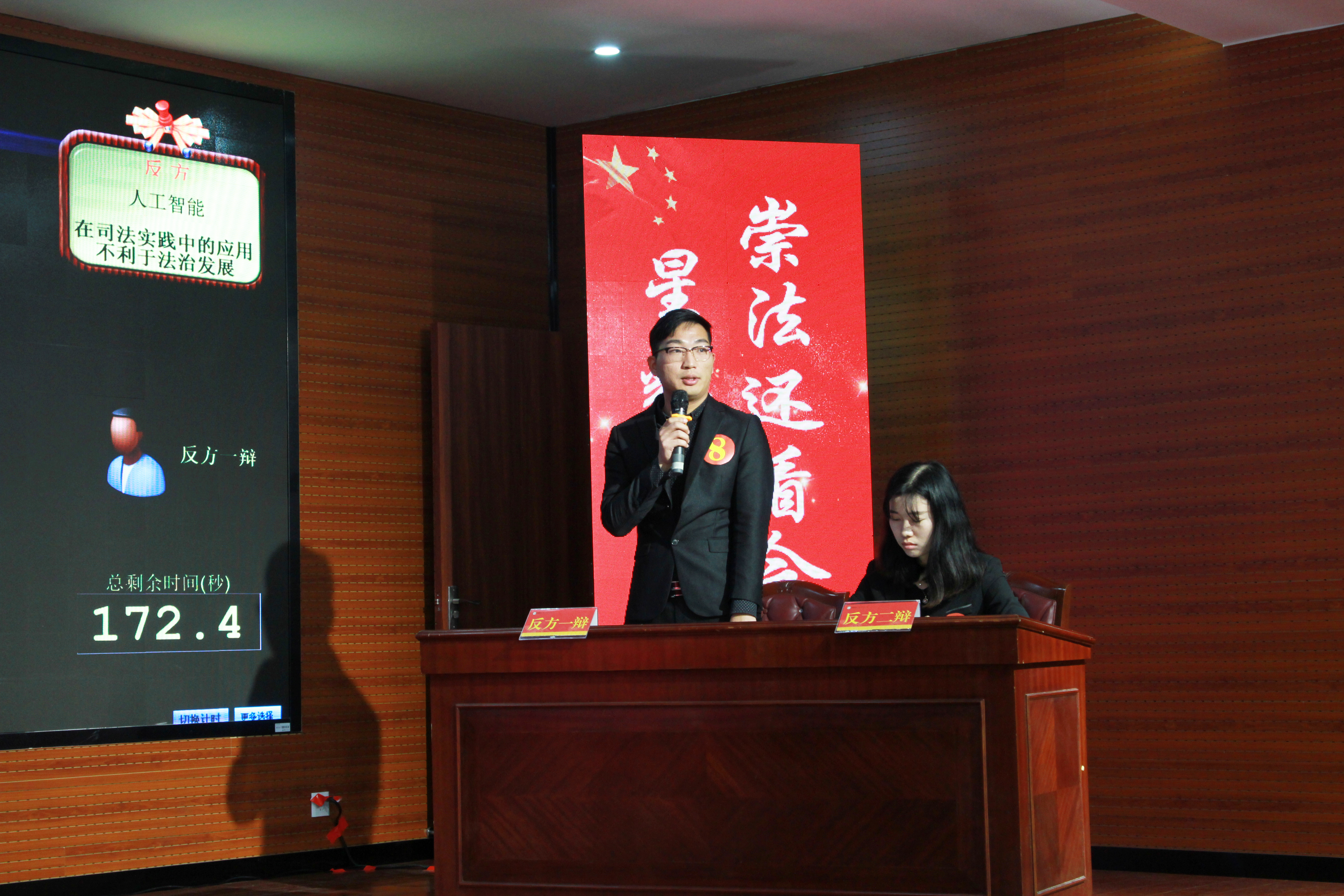 第三环节选手辩论“才辩无双”。进入第三轮的4位选手,抽签形成两组,分别持正反两方,由评委老师自主办方准备的2个辩题中抽取一题作为辩题,选手以“2对2”对辩的形式进行辩论,由评委对四位选手进行现场打分。辩论环节的话题是人工智能在司法实践中的应用是否有利于法治发展。正反双方思如泉涌,控时准确,展现出法律人应有的应变能力和沉着冷静,最后,孔明选手和韩童选手以其优异的表现获得了评委们的青睐,挺进最后环节。