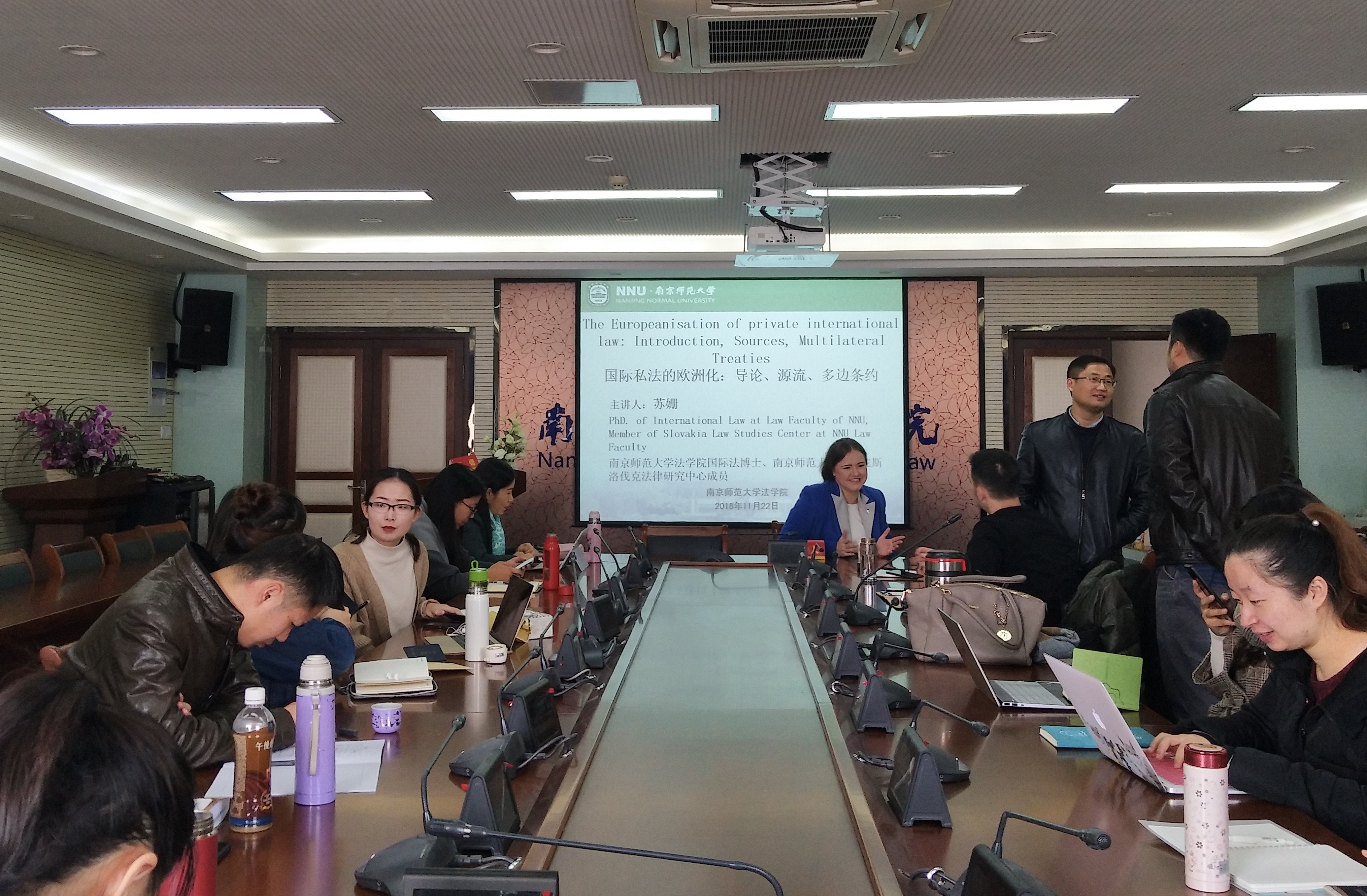 讲座主要从三个方面展开,首先是介绍什么是国际私法;其次分析了国际私法的渊源;最后介绍斯洛伐克的概况。在介绍国际私法时,苏姗谈到,随着全球化的日益加深,国际私法与公民、法人等民商事主体越来越紧密相关,法律关系的主体、客体以及法律事实等方面经常会出现涉外因素。在谈到国际私法的渊源时,苏姗分别从国际层面、欧洲层面以及国家层面探讨了这一问题,尤其是重点分析了欧盟的一系列国际私法条约,分析各条约的产生背景、效力、实施及相互关系等,从而使大家对国际私法的条约渊源有了更清晰的认识。最后苏姗还介绍了自己的祖国——斯洛伐克,并介绍了斯洛伐克的经济发展及法学教育。参加讲座的汪驰博士更是用自己在斯洛伐克攻读博士的亲身体会,说明随着“一带一路”建设及中国与中东欧国家“16+1”合作机制的深入发展,斯洛伐克已经与我国互认教育学历,到斯洛伐克学习法学具有广阔的职业前景。