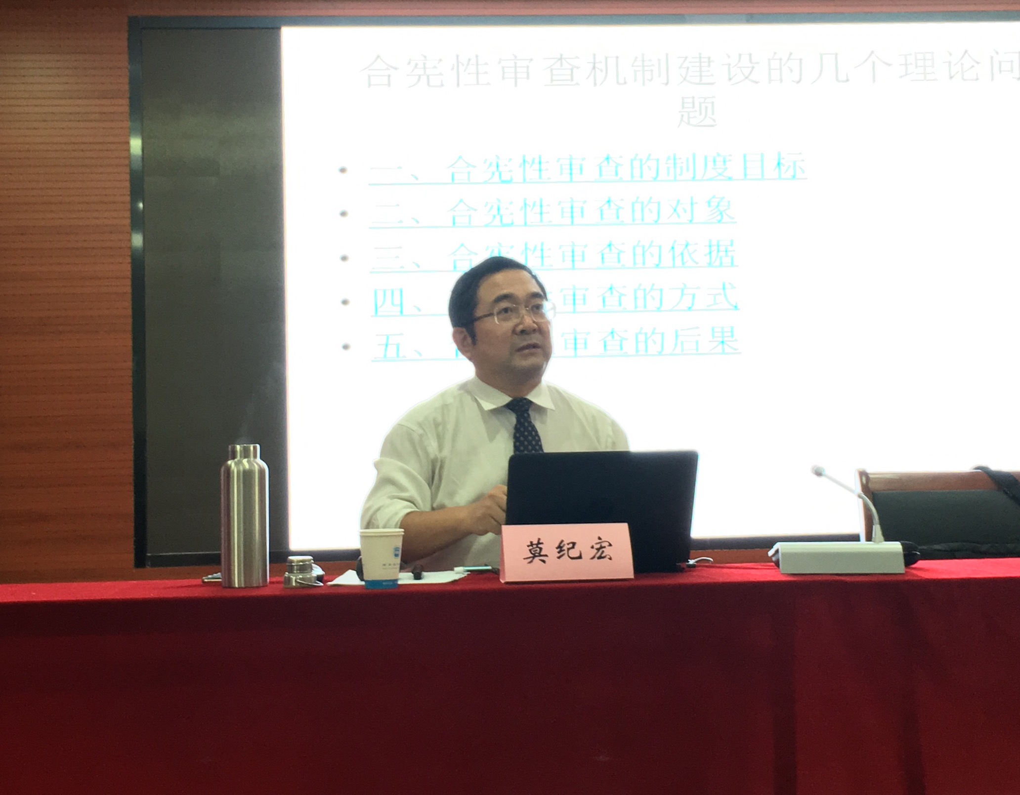 最后,莫教授提用五个关键理论问题来阐述合宪性审查。一是合宪性审查的制度目标,这一制度目的在于一旦出现违宪行为,能够及时纠正,以保证宪法的全面、有效实施。一切法律、行政法规和地方性法规都不得同宪法相抵触,一切违反宪法和法律的行为,必须予以追究。二是合宪性审查的对象,一种是审查法律法规和其他规范性文件是不是跟宪法相冲突;另一种是解决实际工作中的争议。三是合宪性审查的依据,即合宪性、必要性和合目的性三种标准。四是合宪性审查的方式,要做到对审查对象的“事前修正,事后确认”。五是合宪性审查的后果,即对于所审查法律及政府行为有效无效、是否违宪等做出判断。