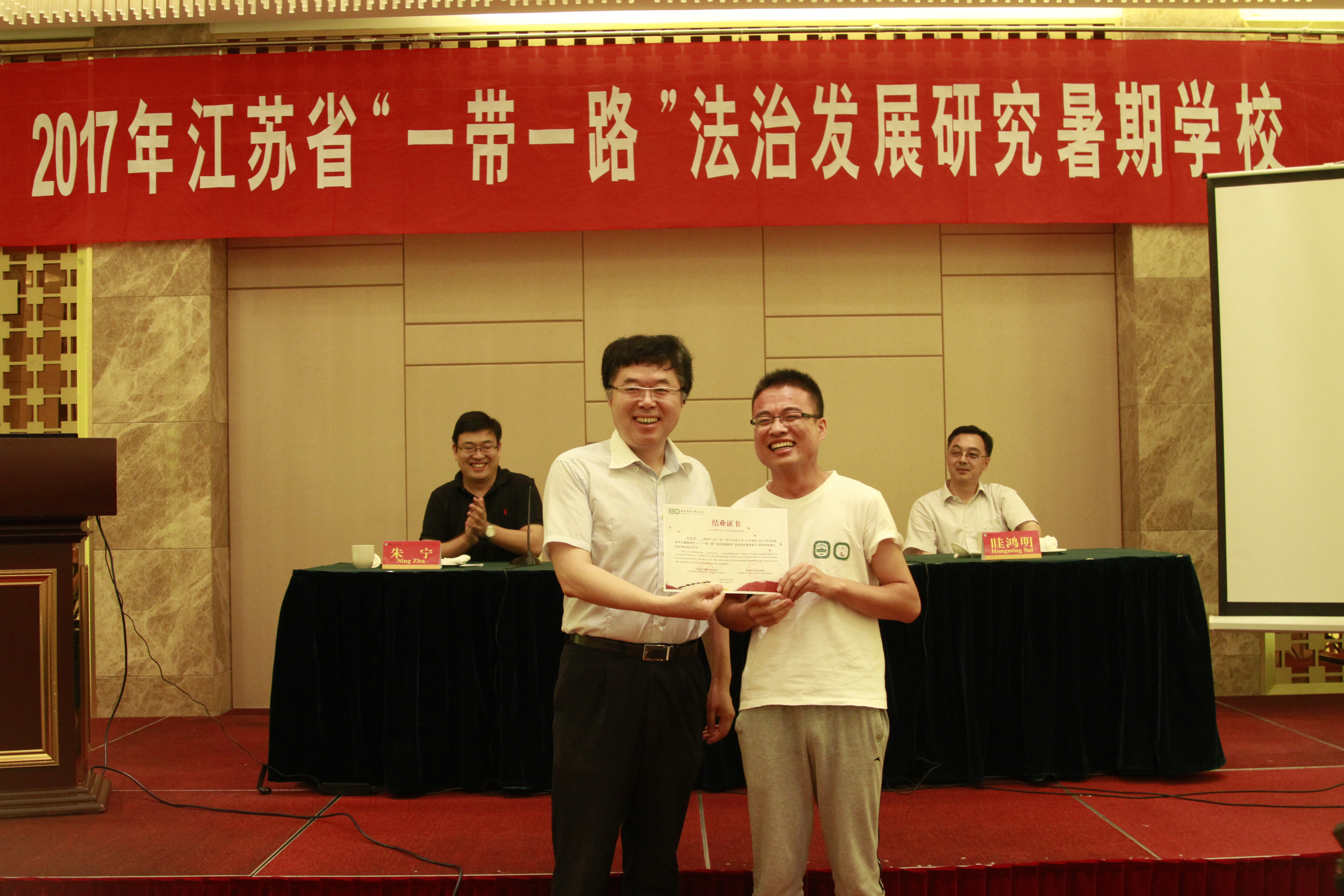 院长蔡道通教授为每位完成学习课程、考核合格的学员颁发了结业证书并合影留念。至此,2017年江苏省“一带一路”法治发展研究暑期学校在热烈的掌声和喜悦的笑容中圆满落幕。