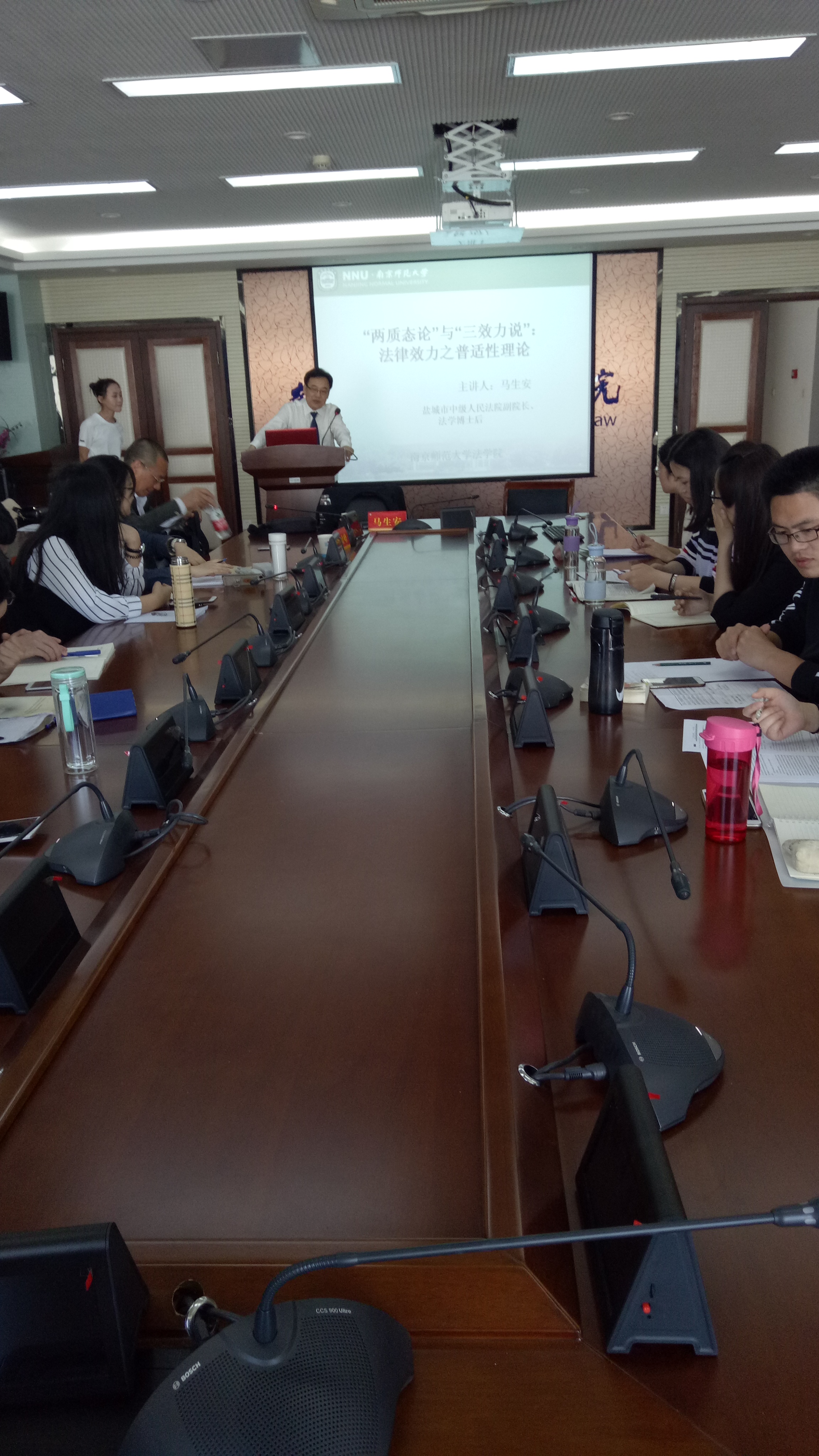 4月28日下午2点,盐城市中级人民法院马生安副院长在南京师范大学行敏楼434会议室举行了题为“‘两质态论’与‘三效力说’:法律效力之普适性理论”的讲座,此次讲座由杨登峰教授主持并担任本场讲座评议人。