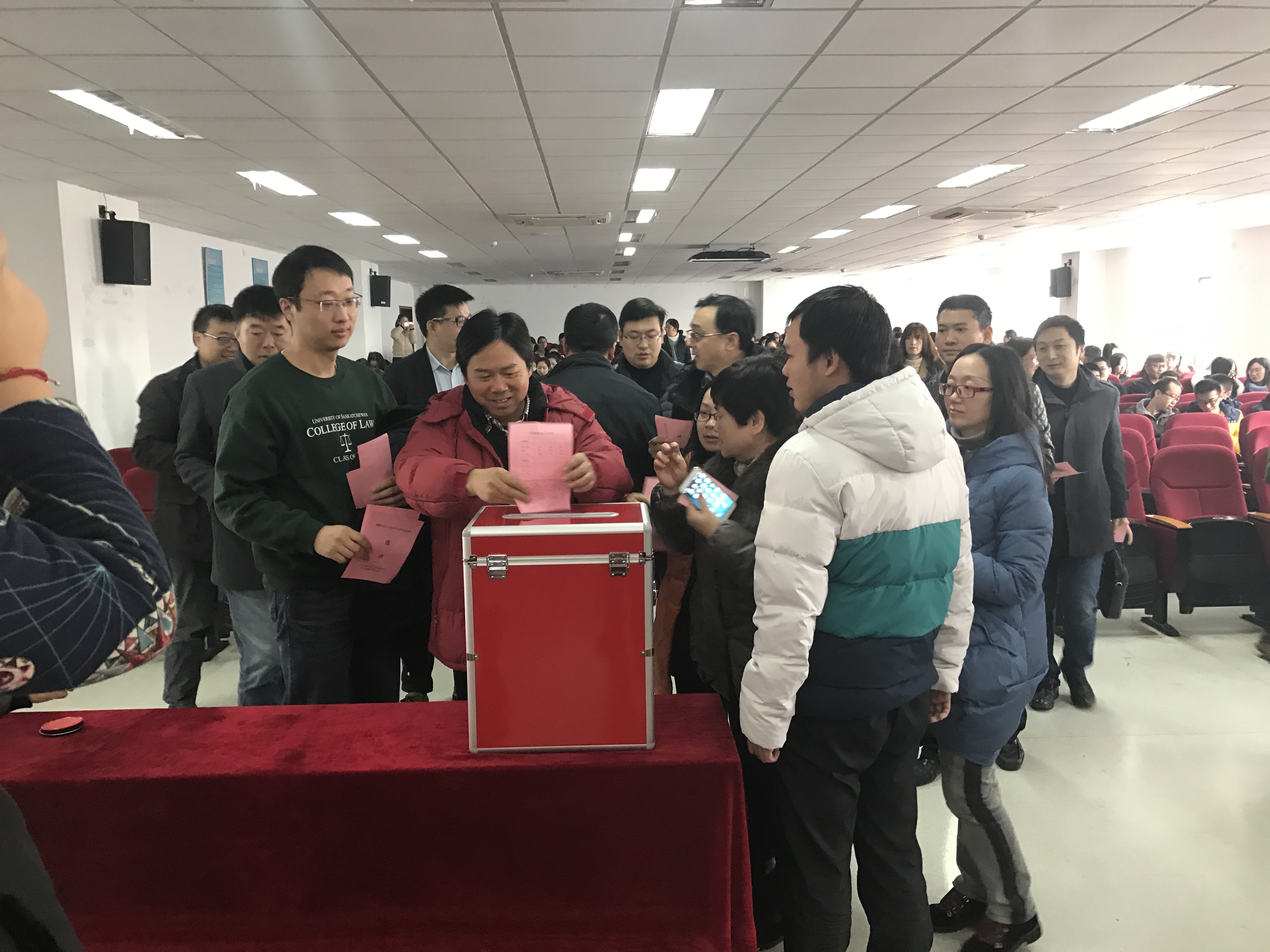 投票站的选举工作分为四场进行。选举当日,现场秩序井然,工作人员早早来到选举现场,布置投票站各项事宜。佩戴有“监票人”“计票人”等字样工作牌的工作人员各司其职,维护了良好的选举投票秩序。选举开始,选民首先集体奏唱国歌,会场气氛庄严肃穆。其后眭鸿明主任进行了动员讲话,重申了人大代表选举工作的重要性,期盼选举工作顺利开展。之后选举正式开始。每场选举开头,经选举工作人员现场清点人数,主持人宣布到会选民人数符合法定要求,即可进行选举。工作人员首先宣读选举办法,并由工作人员向到场选民发放选民证以及空白选票。在选民们现场投票同意选举办法后,两位监票员向选民展示空投票箱,贴上封条,确保选举工作透明公正。选民们则开始填写选票,选择自己心目中 的人民代表。其后投票正式开始,在核对选民身份后,选举工作人员、师生选民排队依次将选票投入投票站前的两个投票箱中,之后将选民证交由监票人盖章后,选民们有序地离开现场。整个选举工作组织严密,进行有序。