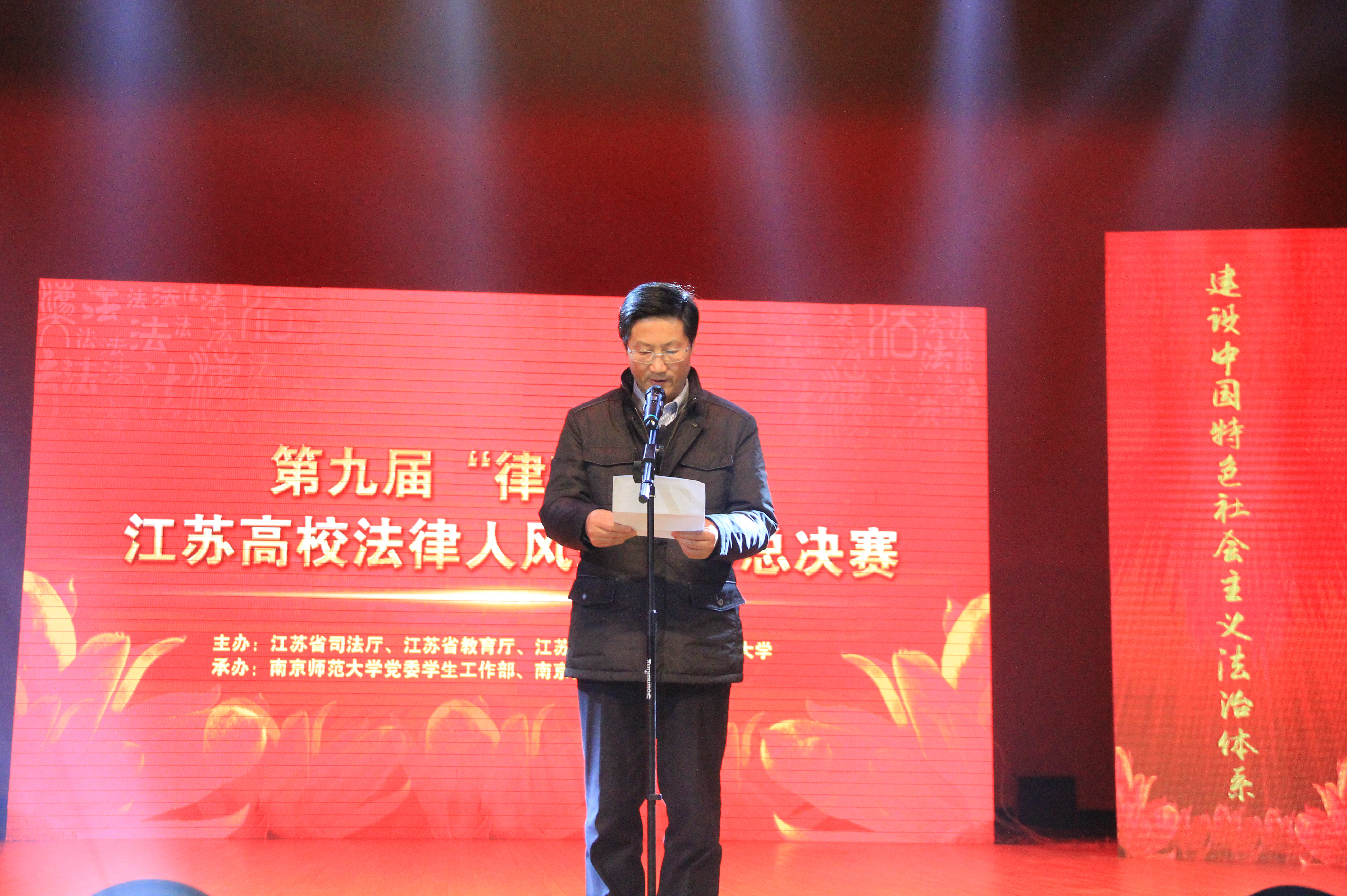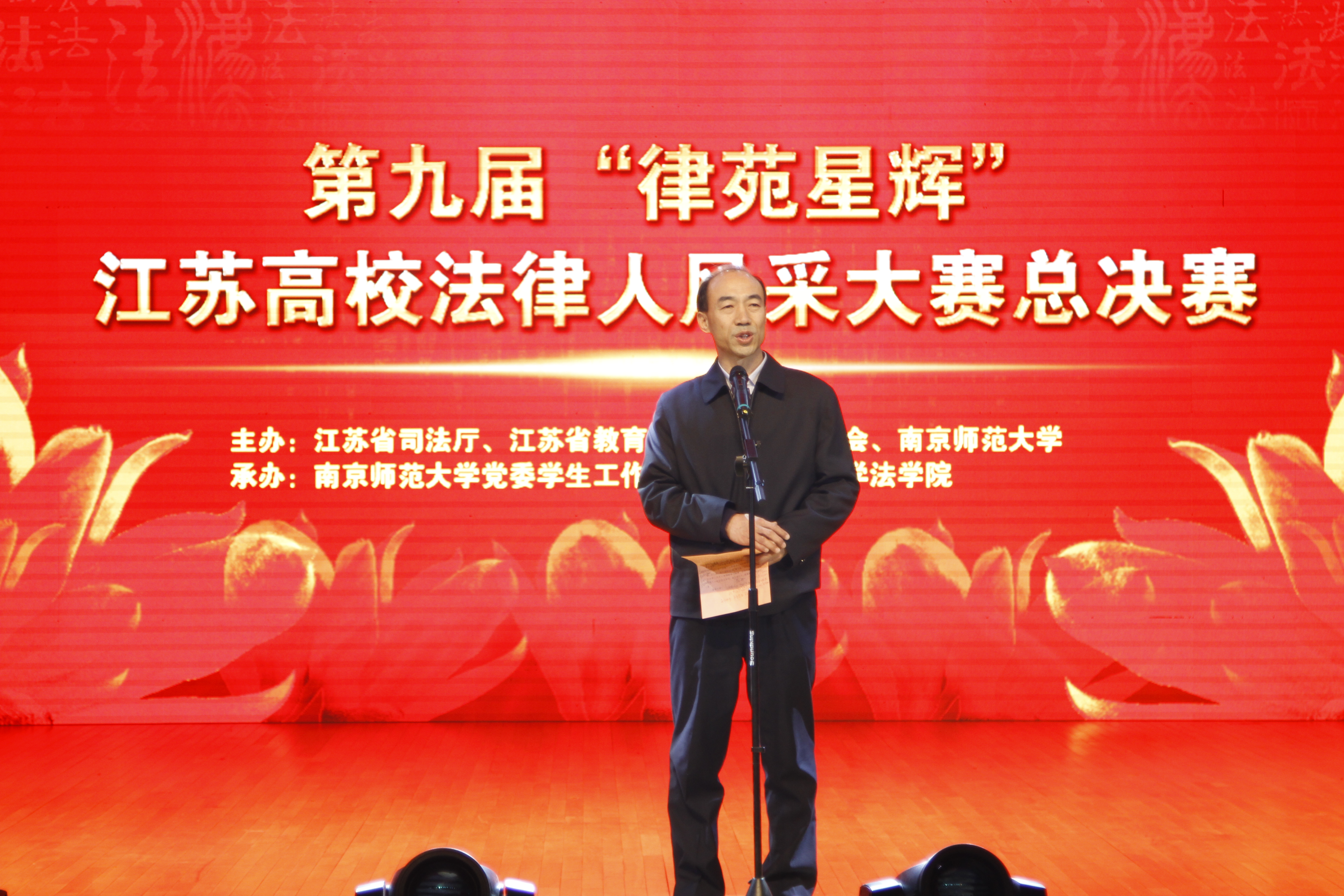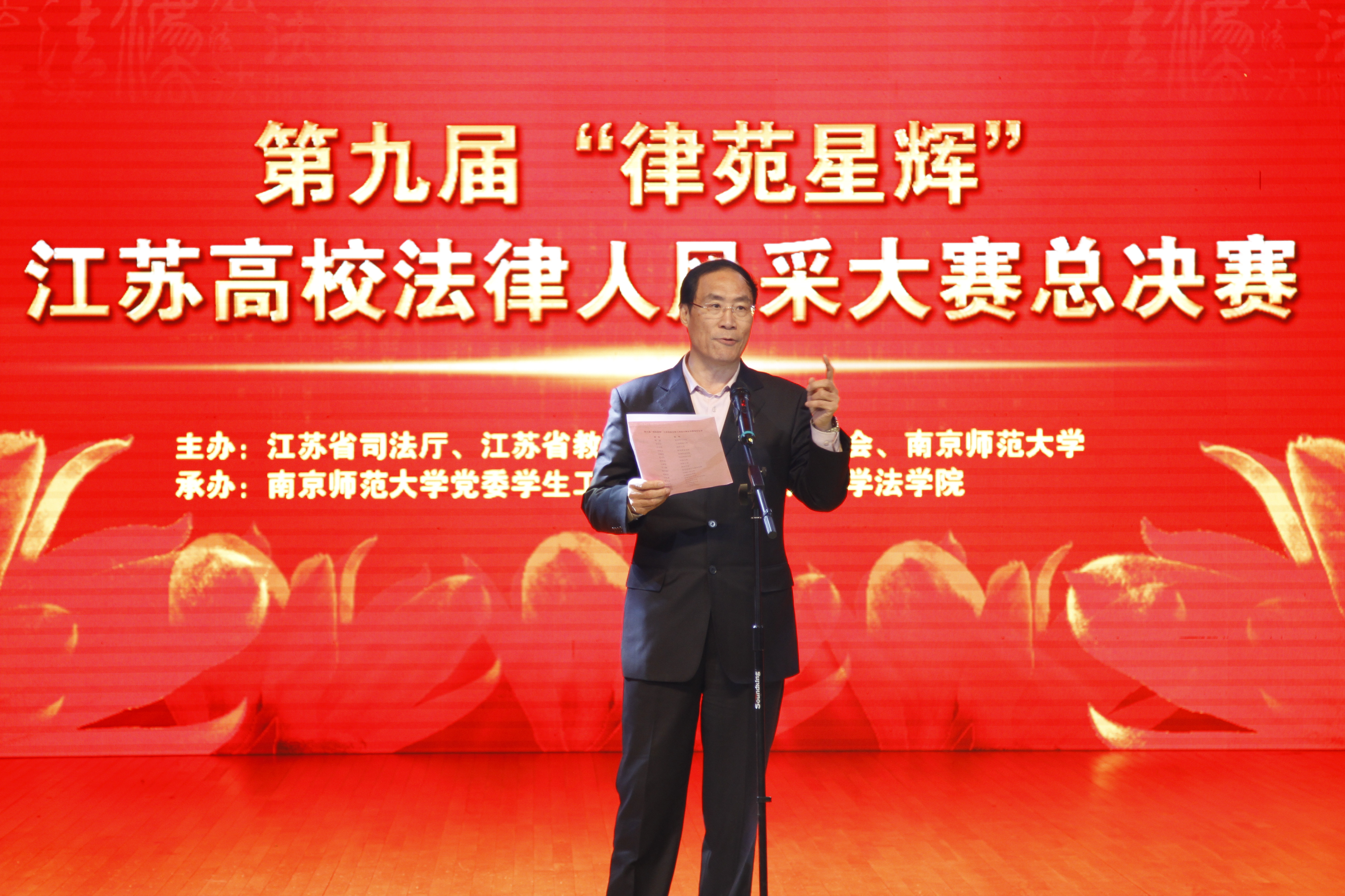 决赛现场,校党委副书记王建教授代表学校致辞。王书记首先向司法部等上级领导单位以及兄弟院校对“律苑星辉”大赛的支持表示感谢。王书记同时指出,校园法治文化建设是依法治校的重要组成部分和具体实践,它反映了新时期高校管理及运作方式的基本特征。我校一直以来高度重视校园法治文化建设,一方面将法律素质培养纳入学生综合素质教育体系中,致力于法学学科和其他学科的发展性融合,以提高全校师生的法治意识和法律素养;另一方面注重加强法治文化阵地建设,通过组织开展常态化的品牌法治文化活动,优化法治文化传播途径,建设健康和谐的校园法治文化。王书记最后表示,南京师范大学将一如既往的给予“律苑星辉”大赛更多的支持和投入,希望大赛在推动全省高校法治文化建设、甚至法治江苏建设中发挥更大作用。