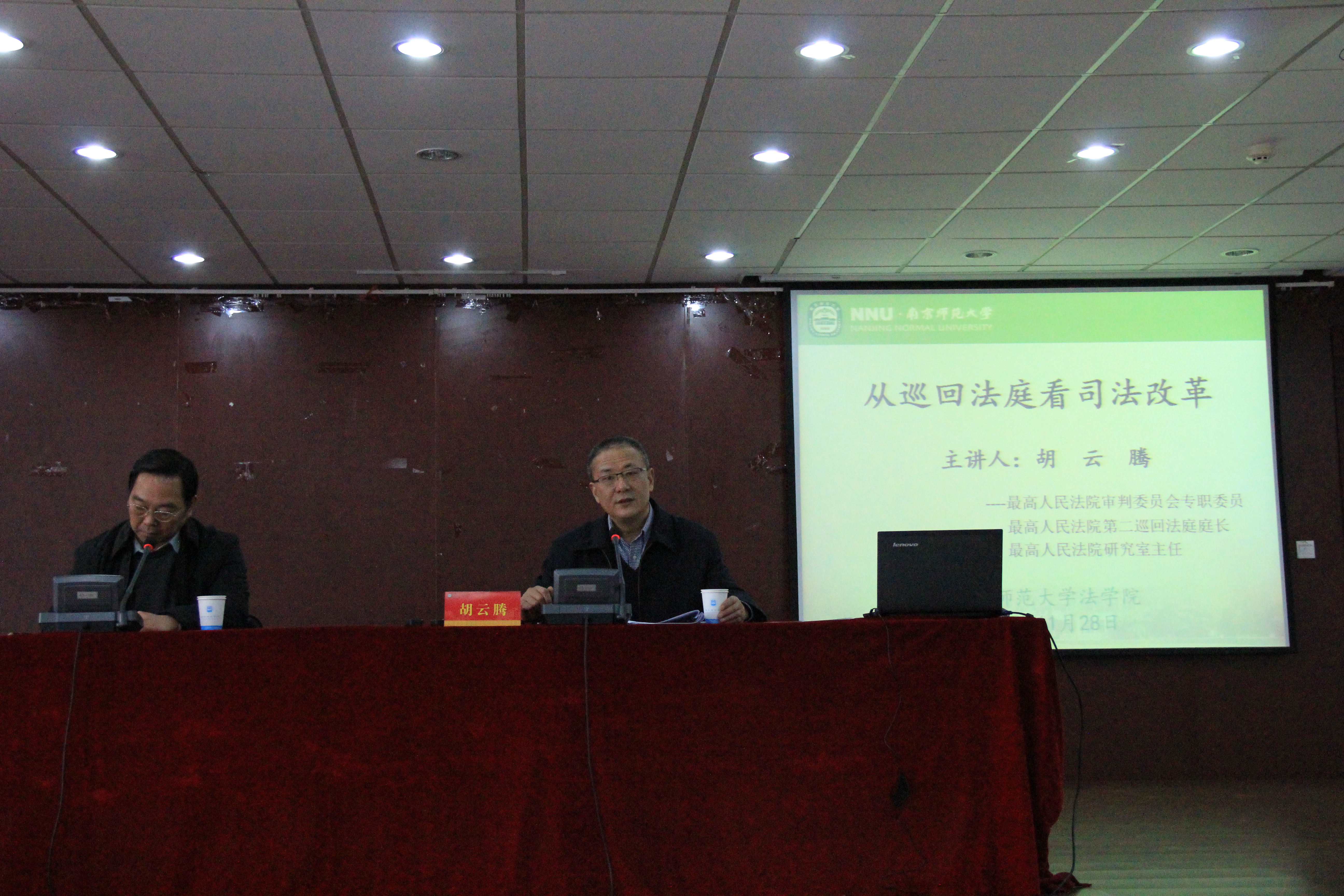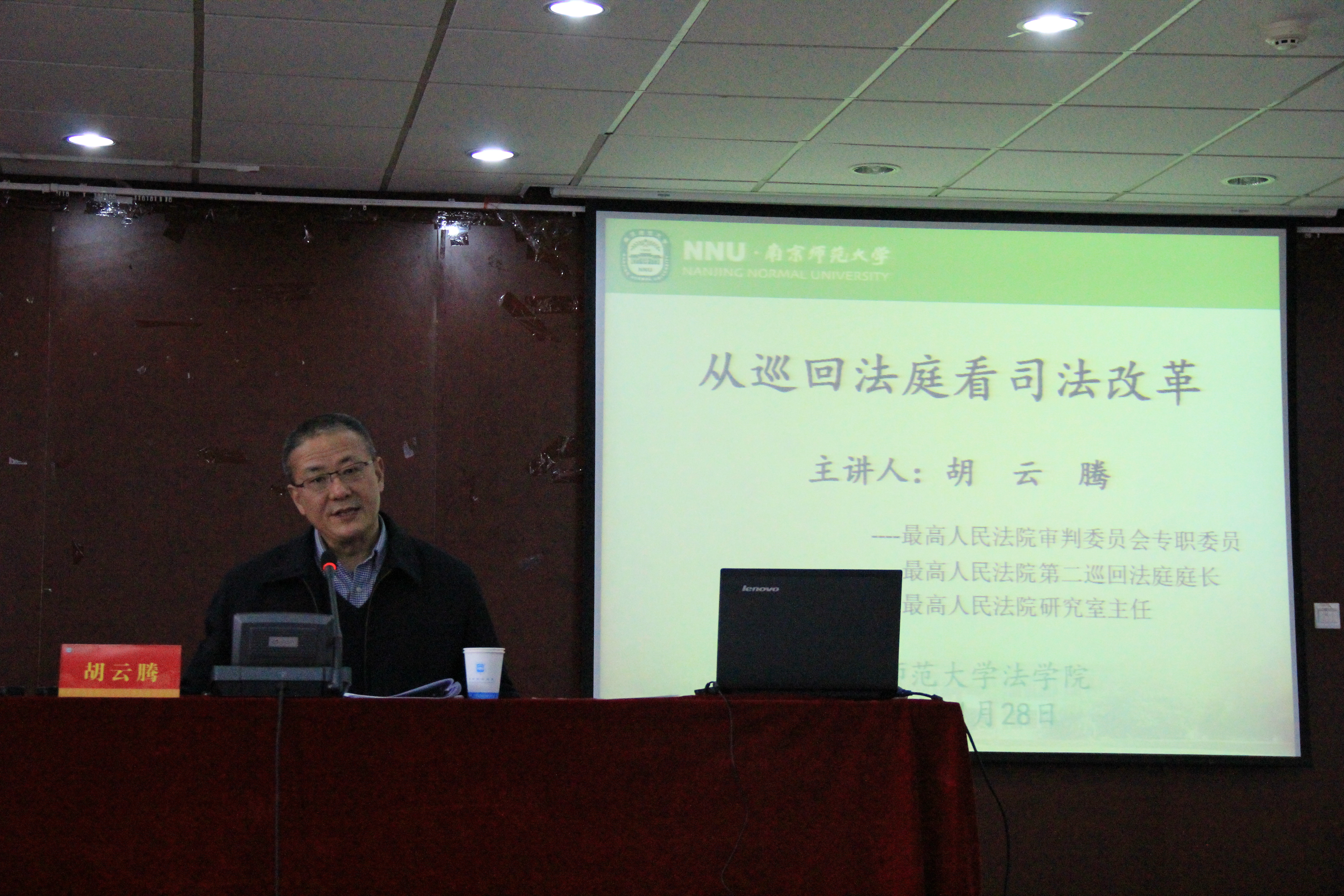 公教授首先感谢胡云腾法官能在百忙之中来到南京师范大学给同学们作专题讲座,在一片热烈的掌声中本次讲座正式开始。讲座的内容包括司法改革的基本特点、设立巡回法庭的目的与效果、关于巡回法庭制度的完善等。谈到司法改革的基本特点,胡法官概括为“5个前所未有”,包括改革的历史机遇前所未有、改革的深度前所未有、改革所带来的争议前所未有、社会各界对此次改革的期待前所未有、改革的广度也是前所未有的,改革的广度包括公安机关、检察院、人民法院、国家安全机关等在内的国家机关的改革,包括司法保障体制、司法职权配置、司法人员管理体制等一系列司法制度的改革。胡法官继续讲到,设立巡回法庭有利于审判中心下移,并且能够缓解最高人民法院的压力,使最高人民法院能够专注于司法政策的制定。从设立巡回法庭的实际效果来看,这一制度确实取得了良好的效果,诉讼便民利民、保证公正司法、提高司法公信力等优点显而易见。但是巡回法庭制度还处在“幼年期”,其中还有很多不完善的制度需要去改革。关于巡回法庭自身的完善,胡云腾法官指出,在今后的巡回法庭制度改革中,法律释明机制、主审法官会议制、严格的审判责任与追究制等司法制度的建设值得探索。