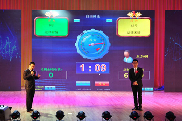 为了全方位的考察选手的法律综合素质,充分展示法科学子的独特风采,本届大赛总决赛设置了多个环节。“知识竞答”环节,以考察选手扎实的法学知识基础;“法谚解读”环节,法谚是法律历史文化的积淀,是法律思想的浓缩和概括,通过此环节可以考察和展示选手对法律文化和思想的理解和认同;“案例分析”环节,要求选手评析法官、检察官或律师在实务中遇到的案例,针对法官、检察官和律师的处理方式提出自己的质疑和理由,以考察和展示选手对法律知识的灵活运用和临场辩驳的能力;“巅峰对决”环节,来自江苏师范大学的王亦斌和南京理工大学的任中涛狭路相逢,他们围绕“法律有请”和“法律无情”展开了激昂辩论,充分展示了法科学子学识渊博和雄辩滔滔的独特魅力。最终,南京理工大学的任忠涛同学以其严密的逻辑、良好的表达、机敏的反应摘得桂冠。