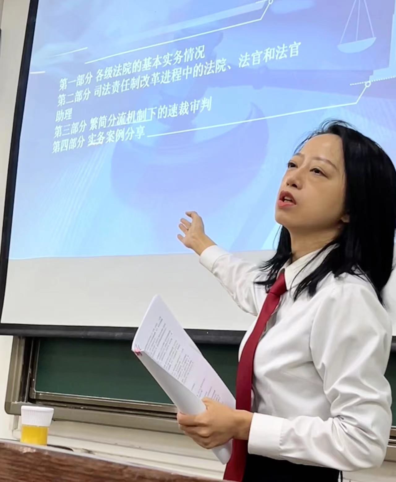 首先皮庭长对各级人民法院的地位及职能做了详细的介绍。为了方便同学们对我国当前的四级法院改革进程有更加深入的了解,皮庭长结合2022年8月30日十三届全国人民代表大会常务委员会第三十六次会议上发布的《最高人民法院关于四级法院审级职能定位改革试点情况的中期报告》进行了拓展介绍。该份报告对“完善审级制度”这一重要改革举措的试点情况、阶段性成就和试点存在的问题和困难进行了详细的介绍。皮庭长结合报告当中的内容与自身的实务经验,让同学们了解学习到了这一报告在司法实践过程中具体展开的路径。皮庭长有丰富的基层法院工作经验,对于报告当中提到的审判重心下沉这一点感受非常深刻,这次的分享课上就这一点与同学们分享了近年来工作中发生的变化与切身感受,激发了同学们极大的兴趣。由于同学们对审判监督程序表达了热情,于是皮庭长就审判监督程序进行了详细的介绍,结合了实务中的具体操作重点介绍了审判监督程序与一审、二审的差异之处,回答了同学们对于审判监督程序的疑惑之处。