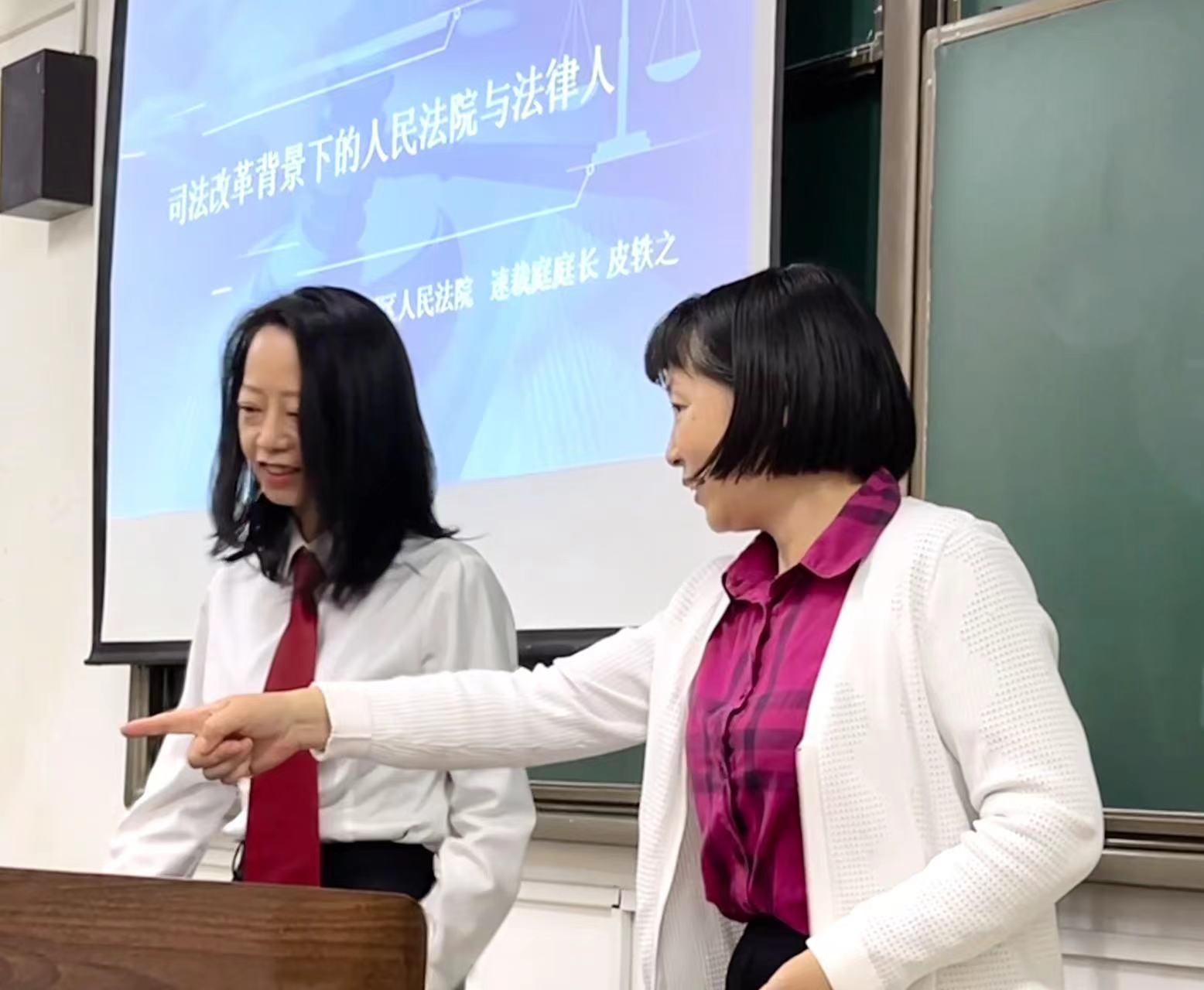 随后皮庭长介绍了司法改革背景下的基层法院、法官和法官助理。由于同学们对于深化司法改革更多的印象仍然停留在理论层面的学习,因此皮庭长带领同学们先回顾了深化司法改革过程中需要重点处理好的五对关系。为了帮助同学们更贴切地感受深化司法改革这一背景下的基层法院、法官和法官助理,皮庭长以自身的经验为例,介绍了书记员、法官助理、法官之间是如何进行配合工作的,同时抛砖引玉讲解了法官助理在司法实践中的具体工作,回应了同学们对于法院中法官助理工作的好奇,这迅速点燃了同学们的热情。皮庭长将理论层面的知识融入实践中加以描述,借助丰富的实践经验帮助同学们进一步了解当前深化司法改革的具体举措。