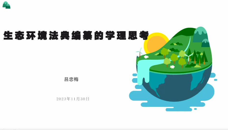 本次讲座重点介绍中国法学会环境资源法学研究会的环境法典编纂研究工作情况以及取得的成果,论述我国生态环境法典编纂条件已经成熟,具有政治基础、内生动力、迫切需求以及理论基础。习近平总书记在中央全面依法治国工作会议上强调,要总结编纂民法典的经验,适时推动条件成熟的立法领域法典编纂工作。2021年,全国人大常委会立法工作计划指出,研究启动环境法典、教育法典、行政基本法典等条件成熟领域的法典编纂工作。在2023年十四届全国人大常委会五年立法规划中,明确将《生态环境法典》列入立法规划一类项目。目前,按照中共中央要求,已经成立了《生态环境法典》编纂领导小组及工作专班。按照目前立法规划进程,工作组以《生态环境法典》于2026年3月获得大会通过作为目标。