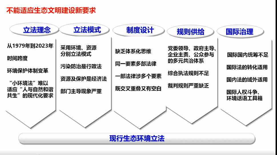 本次讲座内容主要包括三大部分。第一部分分析中国环境立法现状与存在的问题。目前,中国的生态环境法律体系基本建成,国家环境立法30多件,行政法规100多件。但在立法领域存在的问题也十分突出,如环境与经济、公众权利与行政权力的利益冲突,环境法与民法、环境法与行政法等法规范的冲突,以及立法碎片化等。现行生态环境立法不能适应生态文明建设新要求,在立法理念、立法模式、制度设计、规则供给以及国际治理方面存在不足。法典是政治家与法学家合作的结晶,是逻辑与科学思维的结合,学者要发挥应有作用,提供知识资源、理论工具,承担起环境法学者的历史使命,这也是时代赋予的使命。