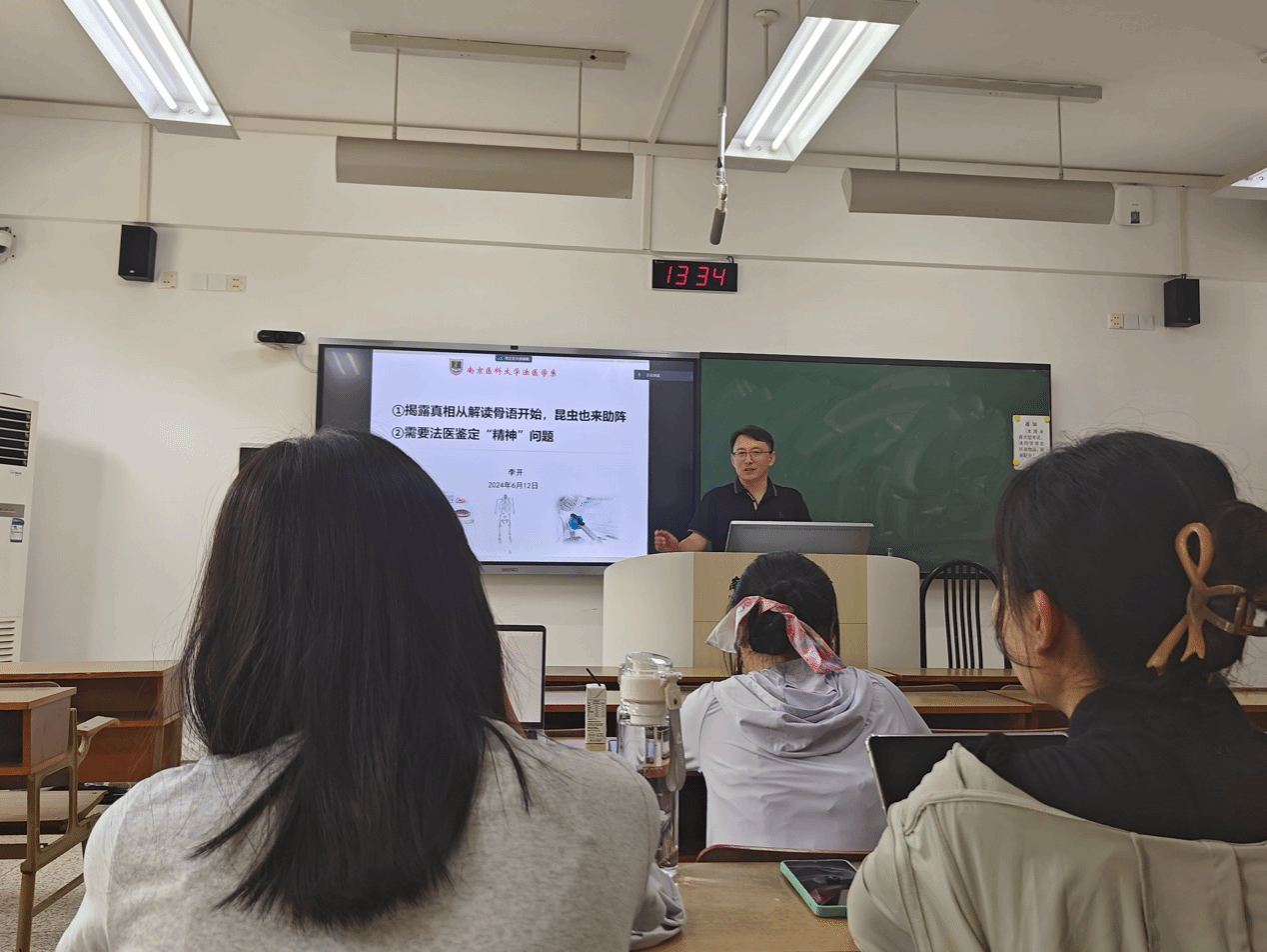 2024年6月12日下午,在我校仙林校区学明楼211教室,南京医科大学基础医学院法医学系教师、南京医科大学司法鉴定所鉴定专家李开老师以“揭露真相从解读骨语开始,昆虫也来助阵,需要法医鉴定‘精神问题’”为题开展了一场司法鉴定方向法硕的专题讲座。