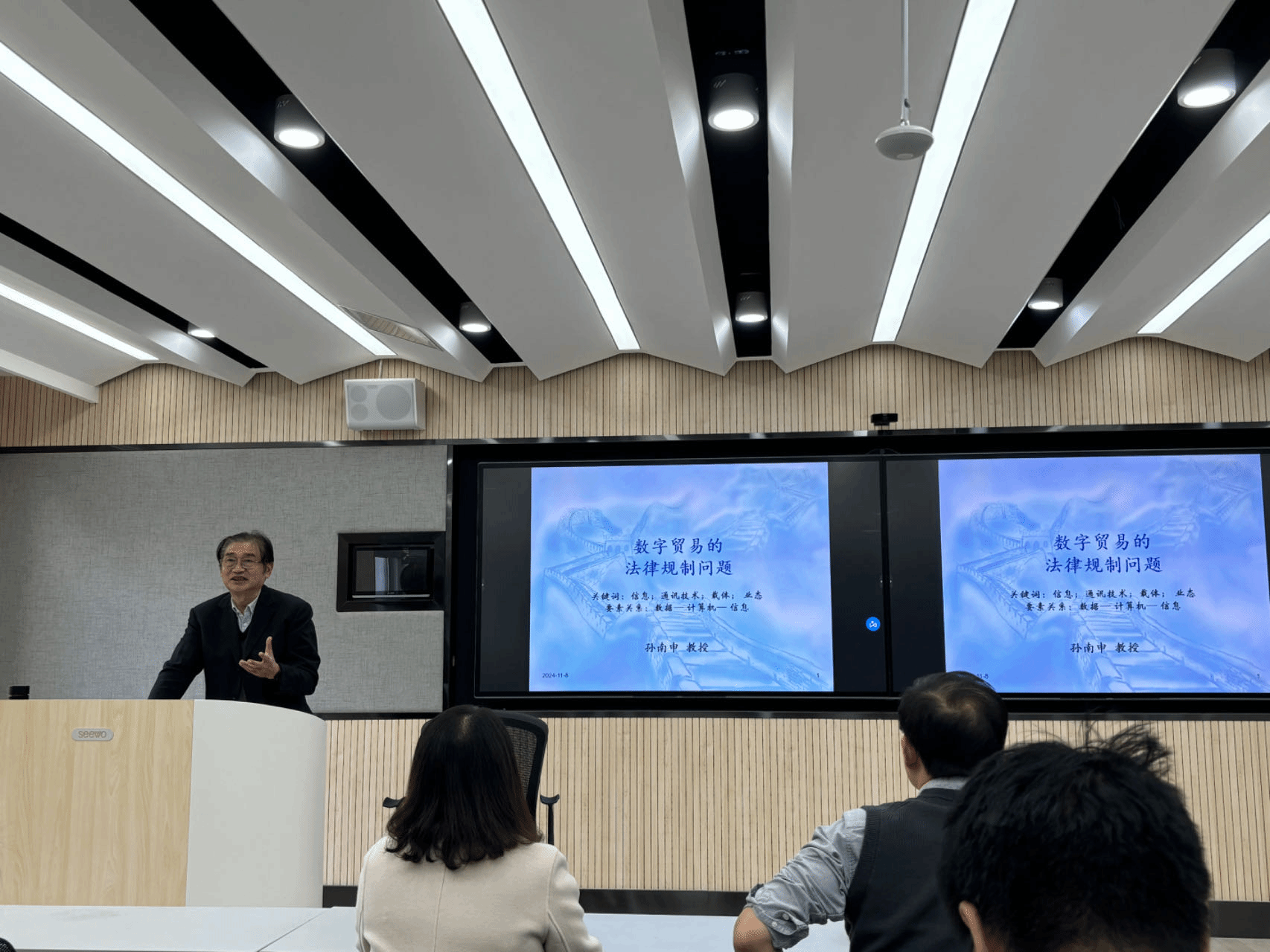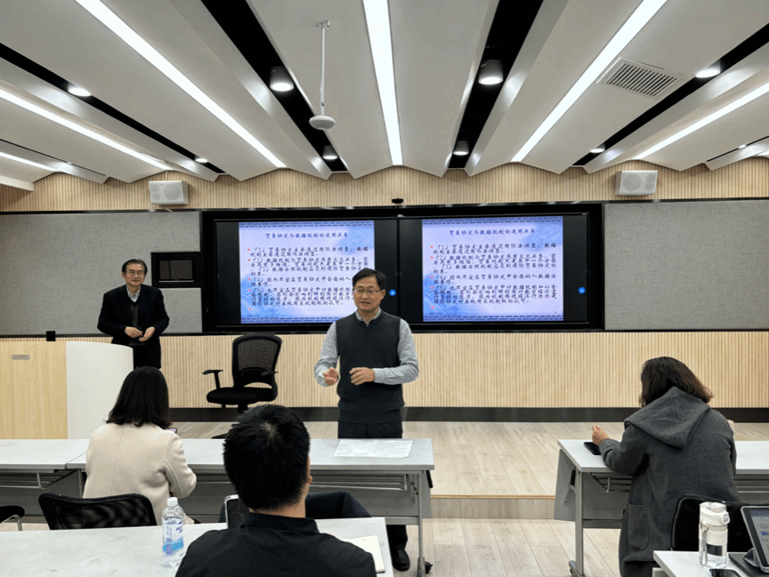 最后,孙南申教授与在座师生进行学术交流互动。肖威副教授对讲座主题和内容进行了高度概括并交流了自身的学习体会,颜林副教授以探索精神、敬业精神、自律精神三个词作结,鼓励研究生在数字贸易领域中追求学术前沿。讲座在大家的热烈掌声中圆满结束。