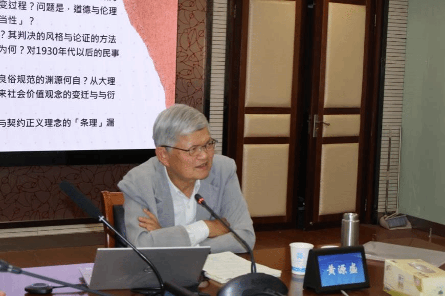 授课伊始,黄源盛教授表示,研究百年民法要有历史想象,要妥善确定研究目标、研究维度以及研究范围。黄源盛教授从两则大理院判例谈起,提出民初北洋政府(1912-1928)无民法典时期,民事审判所依据的法源是什么,“条理”在民初司法实践中扮演什么角色,以及道德与伦理该不该法律化等问题,引导大家进行思考。黄源盛教授指出,近代中国民事立法趋向是从个人本位到社会本位,在法律社会化的立法修法过程中,要求契约正义的呼声越来越高,司法实践中对公序良俗等基本原则的法理阐释与运用也就格外受到重视。