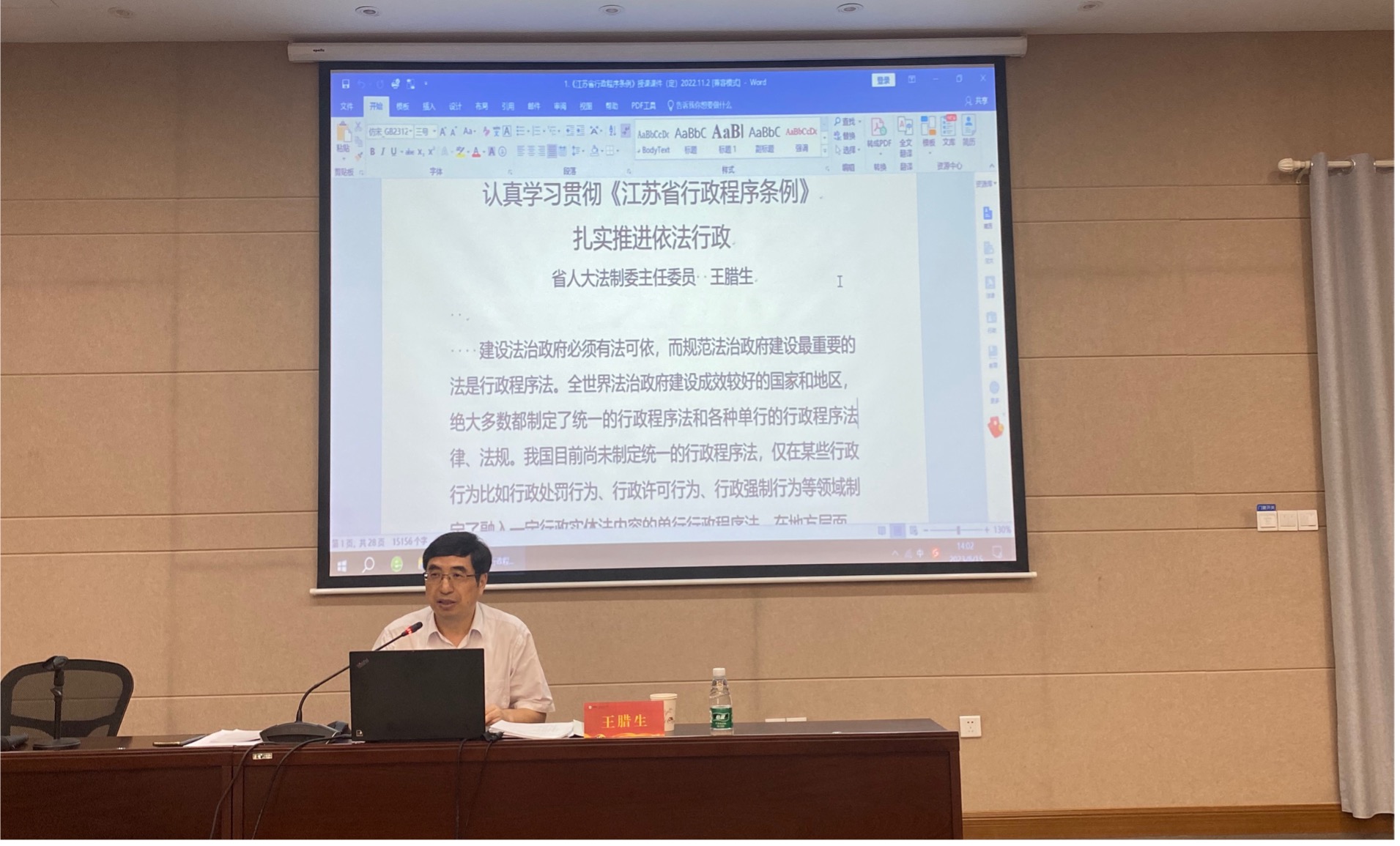 15日下午,江苏省第十三届人民代表大会法制委员会主任委员,十四届省人大法制委法工委分党组副书记王腊生以“认真学习贯彻《江苏省行政程序条例》,扎实推进依法行政”为题,从《江苏省行政程序条例》制定的背景、意义以及实施目的等角度,结合各市、县具体工作情况,与学员们就条例的具体实施与如何积极开展法治建设问题进行了交流和探讨。