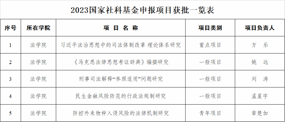 博彩网址大全 本年度国家社科基金项目的申报工作在学校社科院和学院的有力组织下,在多位专家的大力支持和悉心指导下,共有9位老师提交了项目申请,最终有5位老师的申请获得项目立项,命中率56%的优秀成绩。其中,方乐教授的《习近平法治思想中的司法体制改革理论体系研究》课题获年度重点项目立项,姚远教授的《马克思法律思想考证辞典》课题、刘涛副教授的《刑事司法解释参照适用》课题和孟星宇讲师的《民生金融风险防范的行政法规制研究》课题获年度一般项目立项,章楚加讲师的《防控外来物种入侵风险的法律机制研究》课题获年度青年项目立项。