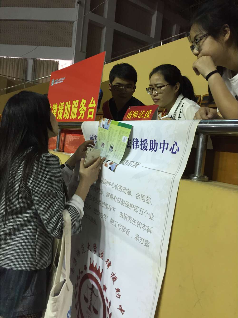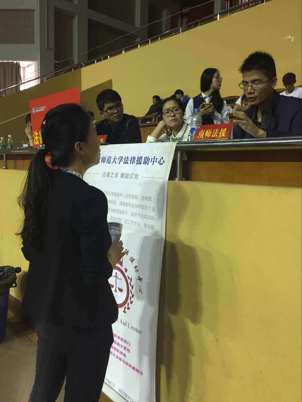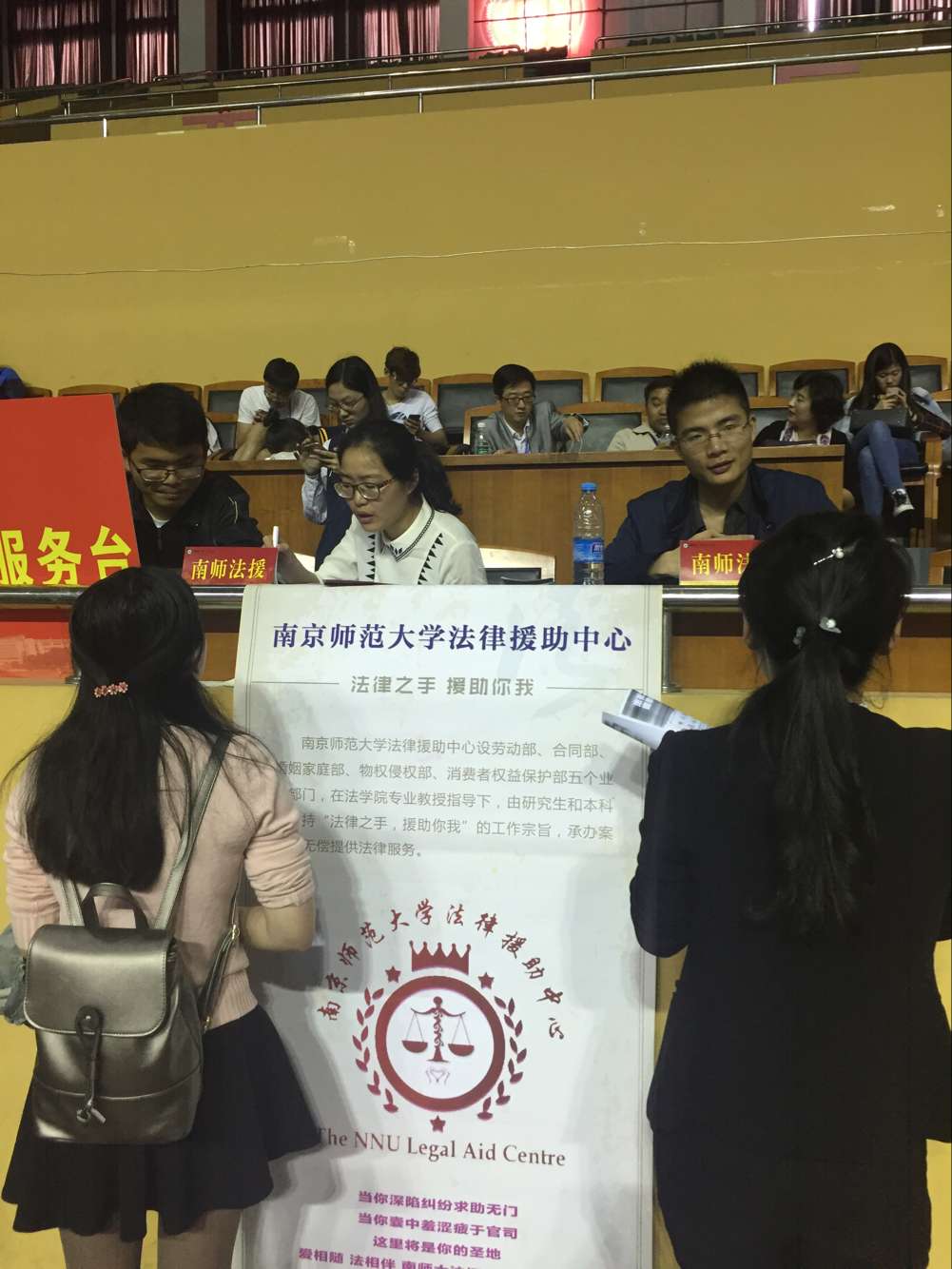 2016年4月13日,再南京师范大学仙林校区体育中心举办了春季招聘会,南师法援劳动部在招聘会现场设计了法律咨询站。