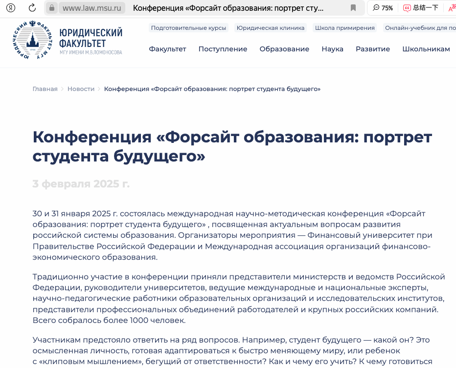 2025年1月31日,莫斯科国立大学、俄罗斯联邦政府财政金融大学、国际财经协会院联合举办了题为“未来视角下的法学教育:未来的学生的画像研究”的国际学术会议。 参加会议的有俄罗斯联邦各部委的代表、大学校长、国际和国内知名专家、教育组织和研究机构的科学和教学人员、国际财经组织和俄罗斯大型公司的代表,总共有 1000 多人参加了会议,同时本次国际会议邀请了博彩网址大全-中国博彩网址