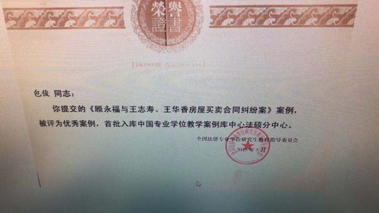 4.《顾永福与王志寿、王华香房屋买卖合同纠纷案》案例于2015年5月被全国法律专业学位研究生教育指导委员会评为优秀案例。